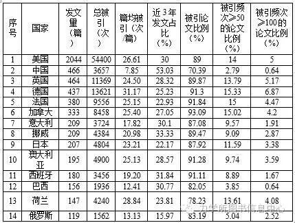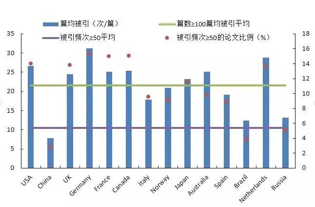 从各国发文的被引情况来看(图3),中国的发文被引次数明显低于其他国家,可能原因是中国的一半以上为最近三年的论文。被引频次≥50的论文比例(%)最高的为德国,其次为加拿大和法国,这些国家的比例均为15%以上。被引频次≥100的论文占比最高的是德国,比例为6.87%。篇均被引在平均值以上除了德国、法国、加拿大之外,还有美国、英国、日本和荷兰。其中被引频次≥50的论文比例在平均值以下的主要有三个国家,分别为中国、巴西和俄罗斯。
