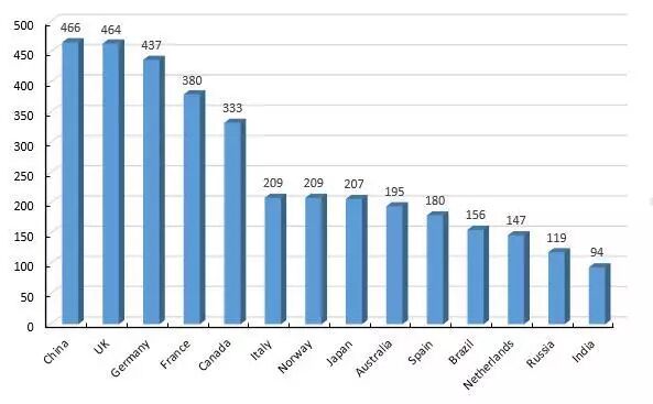 从表1看出,美国、德国和英国的总被引频次最高,均超过10000次,美国的总被引频次为54400,占绝对的优势,这与美国在深水油气资源研究乃至全部涉海研究方面的投入是相符的;法国、加拿大在总被引频次处于第二梯队,总被引频次均在8000以上。篇均被引次数最多的是德国,为31.17次。近三年发文比例最多的是中国,占比超过了53.03%,表明我国的深水油气资源研究正处于一个上升期。在所有发表论文中已经被引用的论文占比最高的是加拿大,为93.09%;其次为德国、法国、澳大利亚和西班牙,被引论文占所有发文的比例为90%以上。