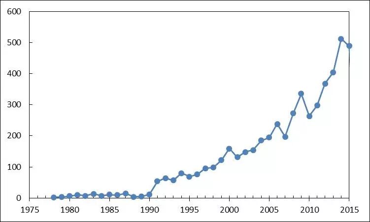 如图1为国际深水油气资源研究的发文量情况。从整体论文年度变化来看,深水油气资源研究在1990年之前的研究处于一个低迷状态,少有研究;而自20世纪90年代开始迅速升温,发文量也呈现迅速增长趋势并在2014年发文量达到顶峰,有512篇相关研究论文被SCIE数据库收录。