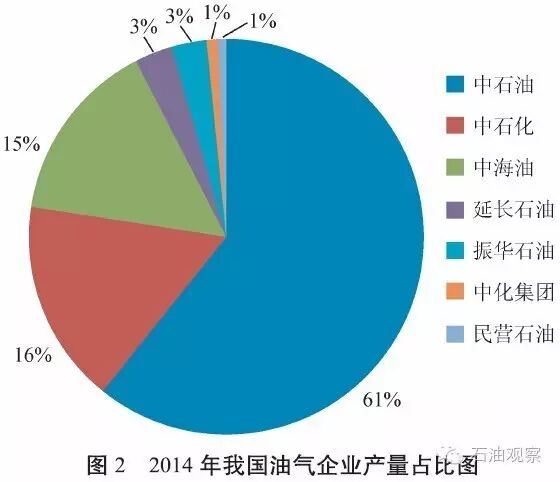 2014年,国内原油生产与海外油气权益约和4.2×10^8 t,其中国内石油产量2.1×10^8 t,天然气1329×10^8m^3。中央石油企业(包括中石油、中石化、中海油、振华石油、中化集团)油气产量占96%,延长石油和其他民营油企占比仅为4%(图2)。
