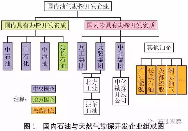 根据是否具备油气勘探开发资质,可将国内石油勘探开发企业分为两大类(图1)。国内具有勘探开发资质的企业有中石油、中石化、中海油和延长石油等4家;国内未具备勘探开发资质的油气企业,如中国北方工业公司(以下简称北方工业)和中国中化集团公司(以下简称中化集团),分别由其子公司振华石油控股有限公司(以下简称振华石油)与中化石油勘探开发有限公司(以下简称中化勘探开发公司)经营油气勘探开发业务,此外还有几十家民营企业通过参股、收购获取油气勘探开发权益,如洲际油气股份有限公司(以下简称洲际油气)、广汇能源股份有限公司(以下简称广汇能源)、复星国际有限公司(以下简称复星国际)、长联石油控股有限公司(以下简称长联石油)、美都控股股份有限公司(以下简称美都控股)、金叶珠宝股份有限公司(以下简称金叶珠宝)、兰州海默科技股份有限公司(以下简称海默科技)、江苏熔盛重工有限公司(以下简称熔盛重工)等。