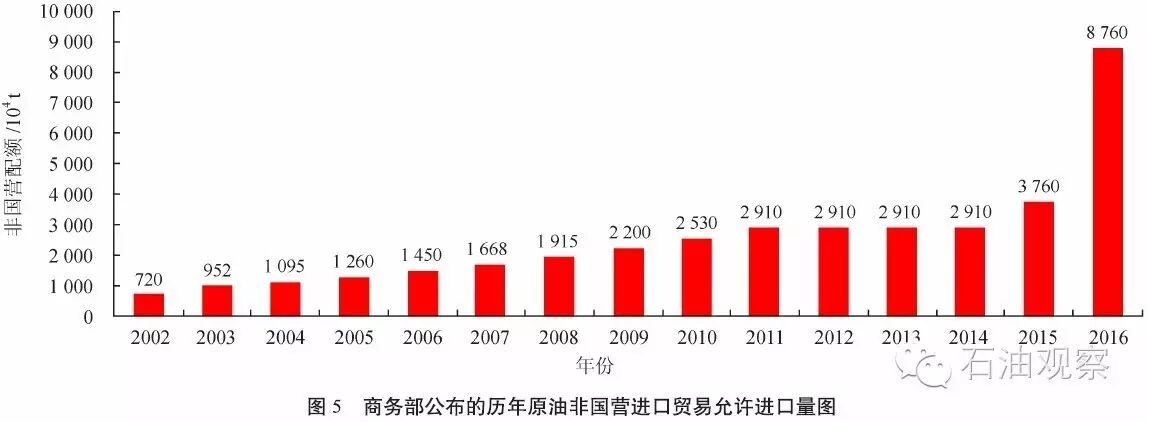 自2002年我国加入WTO后,原油进口贸易被划分为国营贸易和非国营贸易两类,其中非国营石油贸易受进口配额的限制。目前,由国家商务部备案和公布的原油、成品油(燃料油)非国营贸易进口经营企业名单中,具原油非国营贸易进口资质企业共25家,且仅有10家为民营企业。自2002年开始,我国原油非国营贸易进口配额呈现出逐年增加的趋势(图5)。随着国际市场原油价格的不断下跌,非国营原油进口配额量将大幅提高,据商务部日前发布公告显示,2016年我国原油非国营进口配额将达到8760×10^4 t,相比于2015年提高了5000×10^4 t。