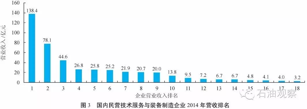 截至2013年底,从事技术服务与装备制造的民营企业有606家,占全国该行业总数的77%,在国内该行业资产的占比为42%。数据显示,2014年国内从事技术服务与装备制造的前18家民营企业营业收入总额达461.4亿元(图3),包含了国内主要的民营石油装备制造企业与油田技术服务企业。