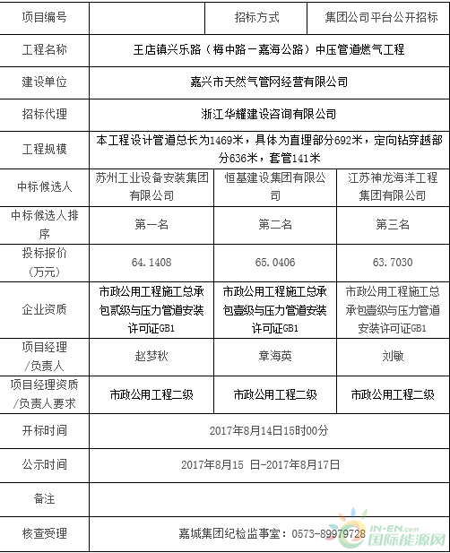 嘉兴市王店镇兴乐路(梅中路—嘉海公路)中压管道燃气工程中标公示