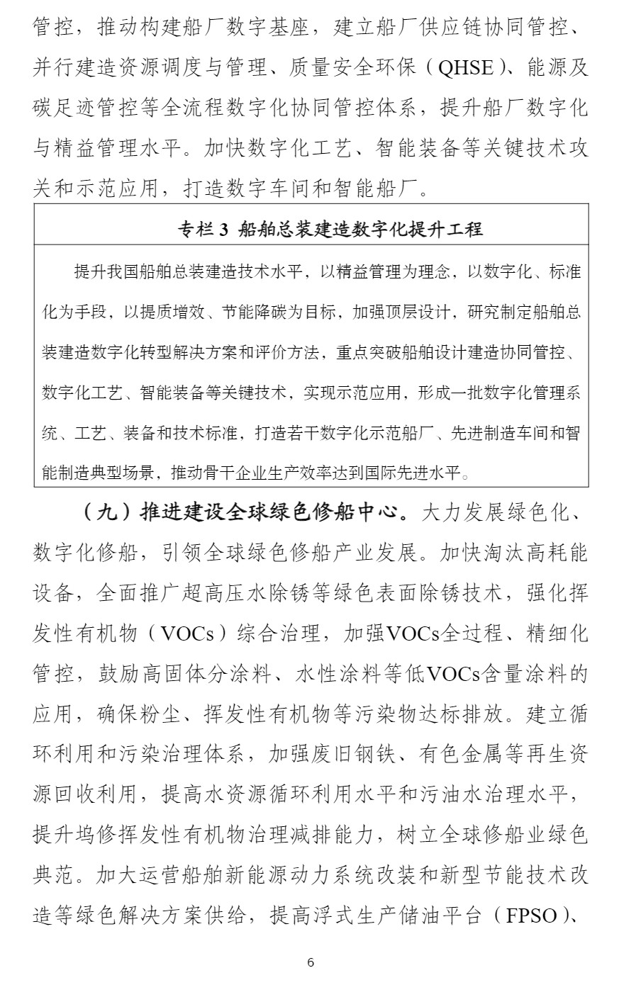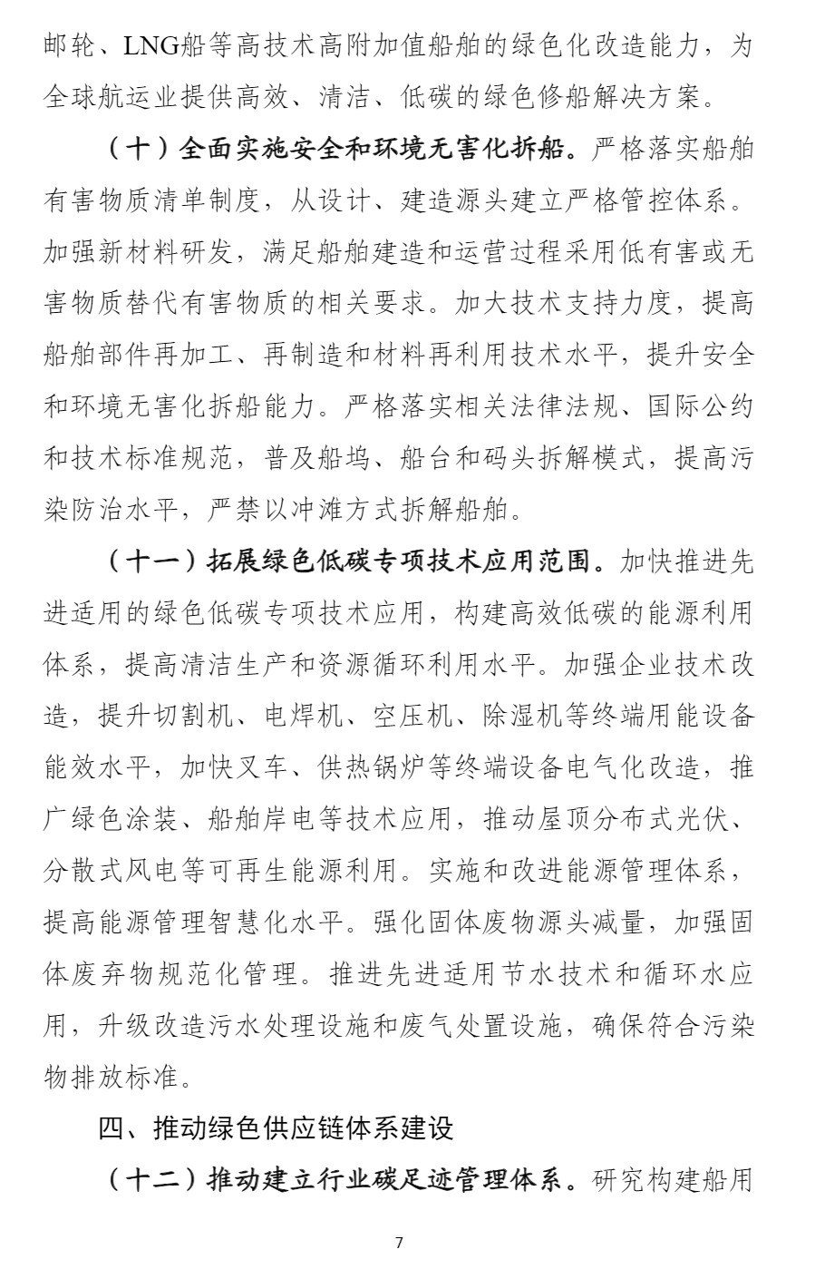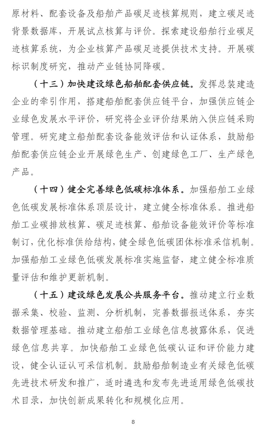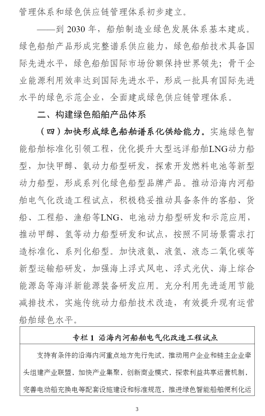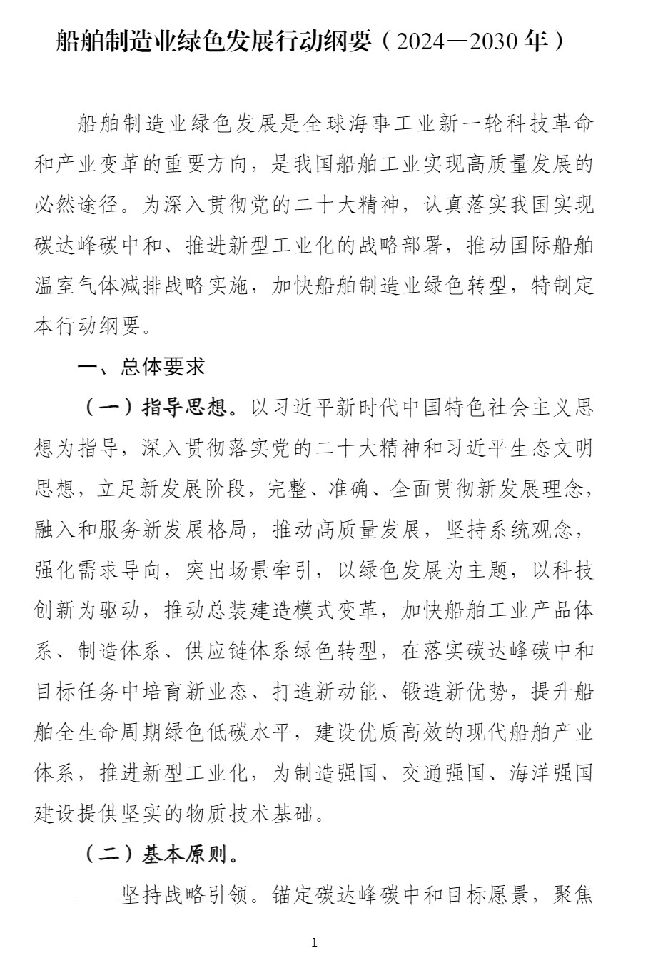 2月28日,工信部等五部门联合印发船舶制造业绿色发展行动纲要(2024—2030年)。到2025年,船舶制造业绿色发展体系初步构建。绿色船舶产品供应能力进一步提升,船用替代燃料和新能源技术应用与国际同步,液化天然气(LNG)、甲醇等绿色动力船舶国际市场份额超过50%;骨干企业减污降碳工作取得明显成效,绿色制造水平有效提升,万元产值综合能耗较2020年下降13.5%;绿色低碳标准体系进一步完善,碳足迹管理体系和绿色供应链管理体系初步建立。到2030年,船舶制造业绿色发展体系基本建成。绿色船舶产品形成完整谱系供应能力,绿色船舶技术具备国际先进水平,绿色船舶国际市场份额保持世界领先。