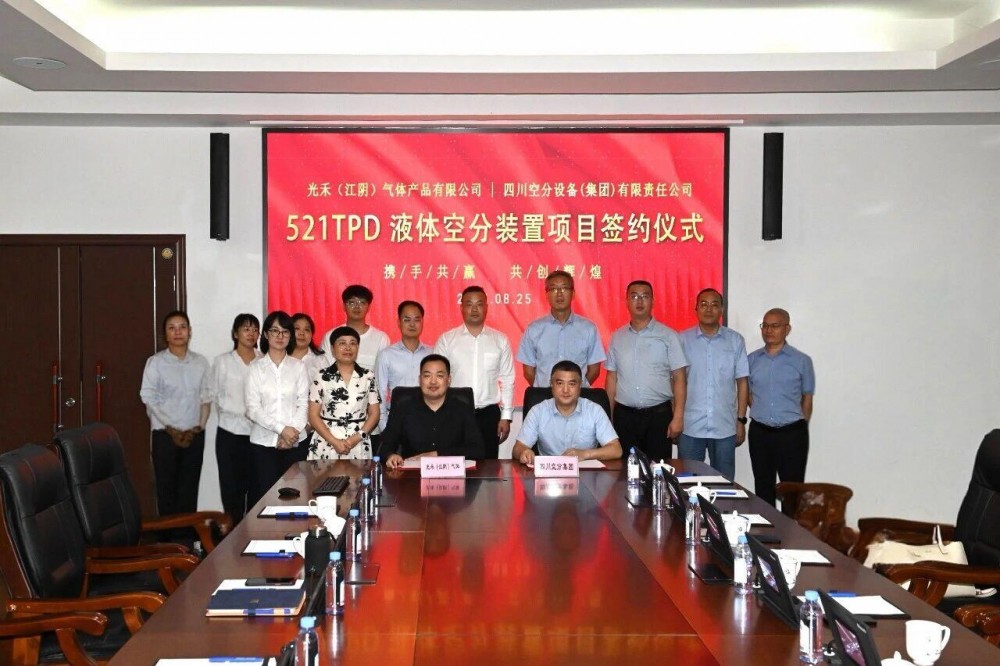 2025年8月25日,在四川空分集团总部,四川空分设备(集团)有限责任公司与光禾(江阴)气体产品有限公司圆满签署521TPD液体空分装置合同。四川空分集团总经理计晓亮与光禾气体公司总经理谢文远代表双方签订合同,四川空分集团党委书记、董事长单凯、光禾气体公司设备总工程师丁玲娟以及管理团队共同出席并见证签约仪式。