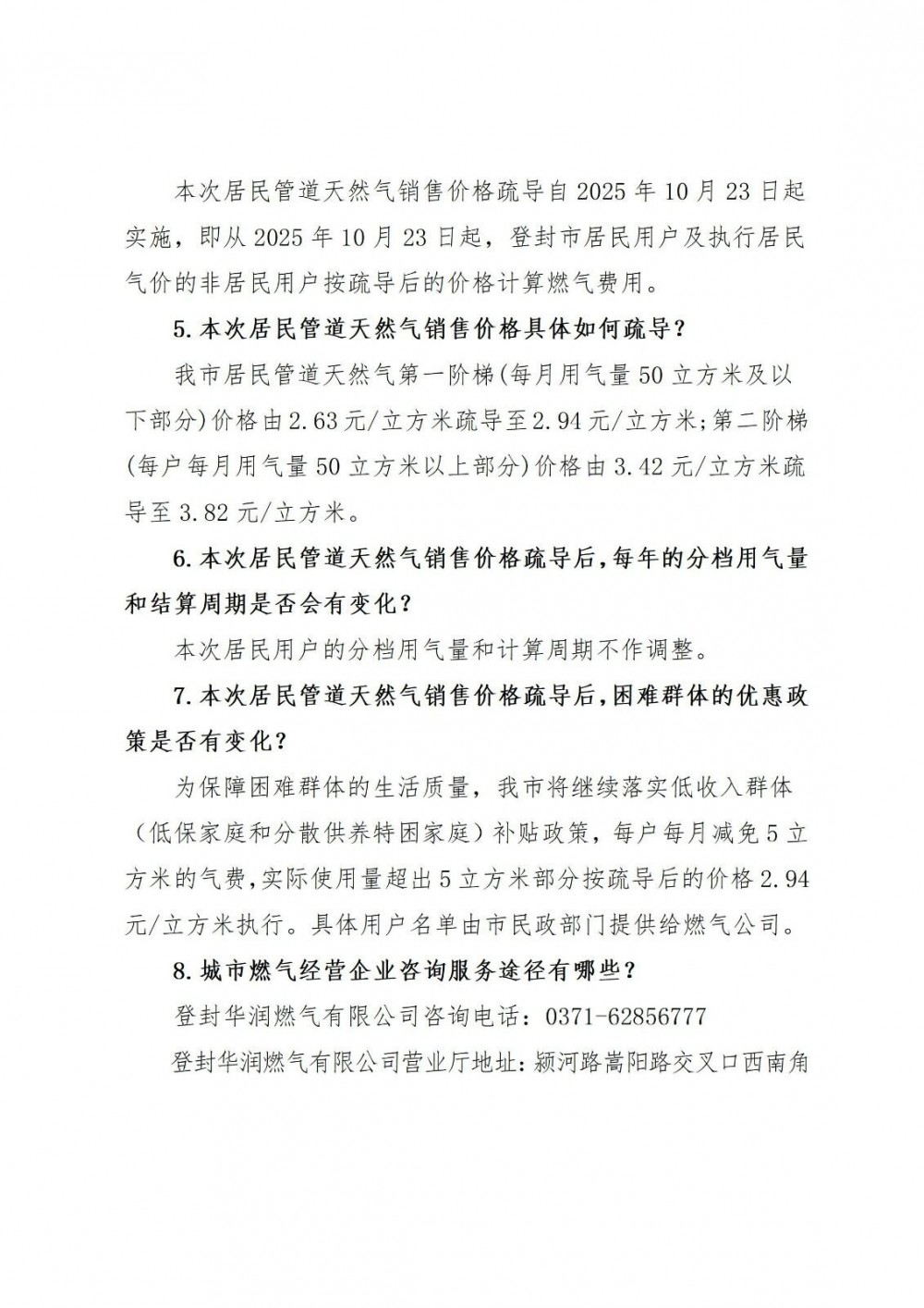 登封市范围内的居民用户及执行居民气价的非居民用户。