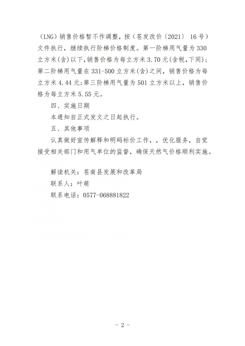 (二)苍南县中油天然气有限公司居民用管道天然气(LNG)销售价格暂不作调整,按(苍发改价〔2021〕 16号)文件执行,继续执行阶梯价格制度。第一阶梯用气量为330立方米(含)以下,销售价格为每立方米3.70元(含税,下同);第二阶梯用气量在331-500立方米(含)之间,销售价格为每立方米4.44元;第三阶梯用气量为501立方米以上,销售价格为每立方米5.55元。