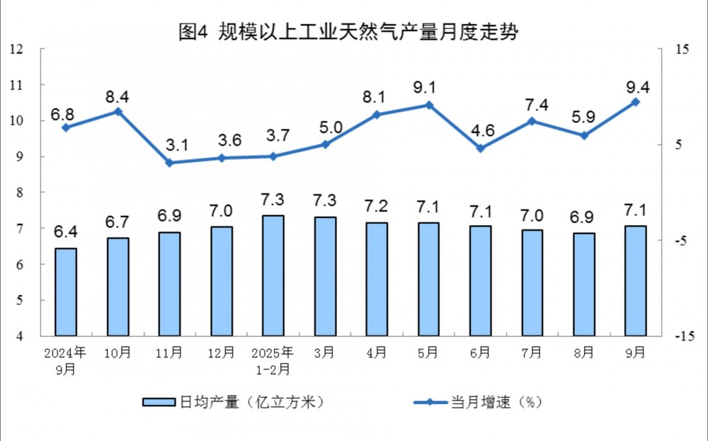 国家统计局数据显示,2025年9月份,全国规上工业天然气产量212亿立方米,同比增长9.4%,增速比8月份加快3.5个百分点;日均产量7.1亿立方米。