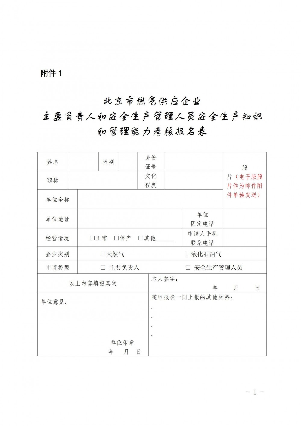 (一)《北京市燃气供应企业主要负责人和安全生产管理人员安全生产知识和管理能力考核报名表》(附件)纸质版和可编辑word电子版各1份(不得涂改),电子版文件命名为"姓名+单位"。