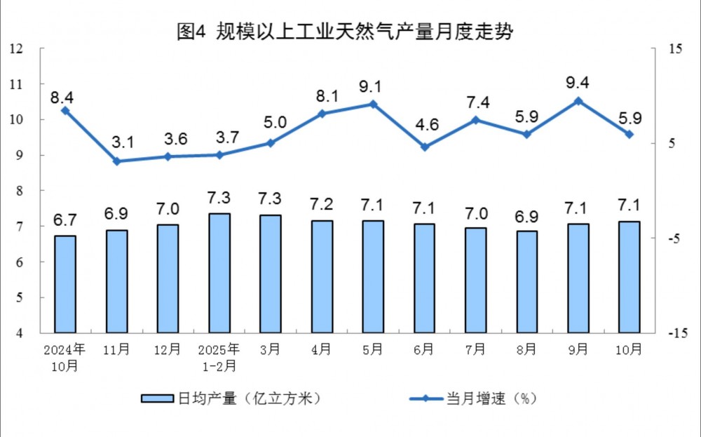 国家统计局数据显示,2025年10月份,全国规上工业天然气产量221亿立方米,同比增长5.9%,增速比9月份放缓3.5个百分点;日均产量7.1亿立方米。2025年1-10月份,全国规上工业天然气产量2170亿立方米,同比增长6.3%。