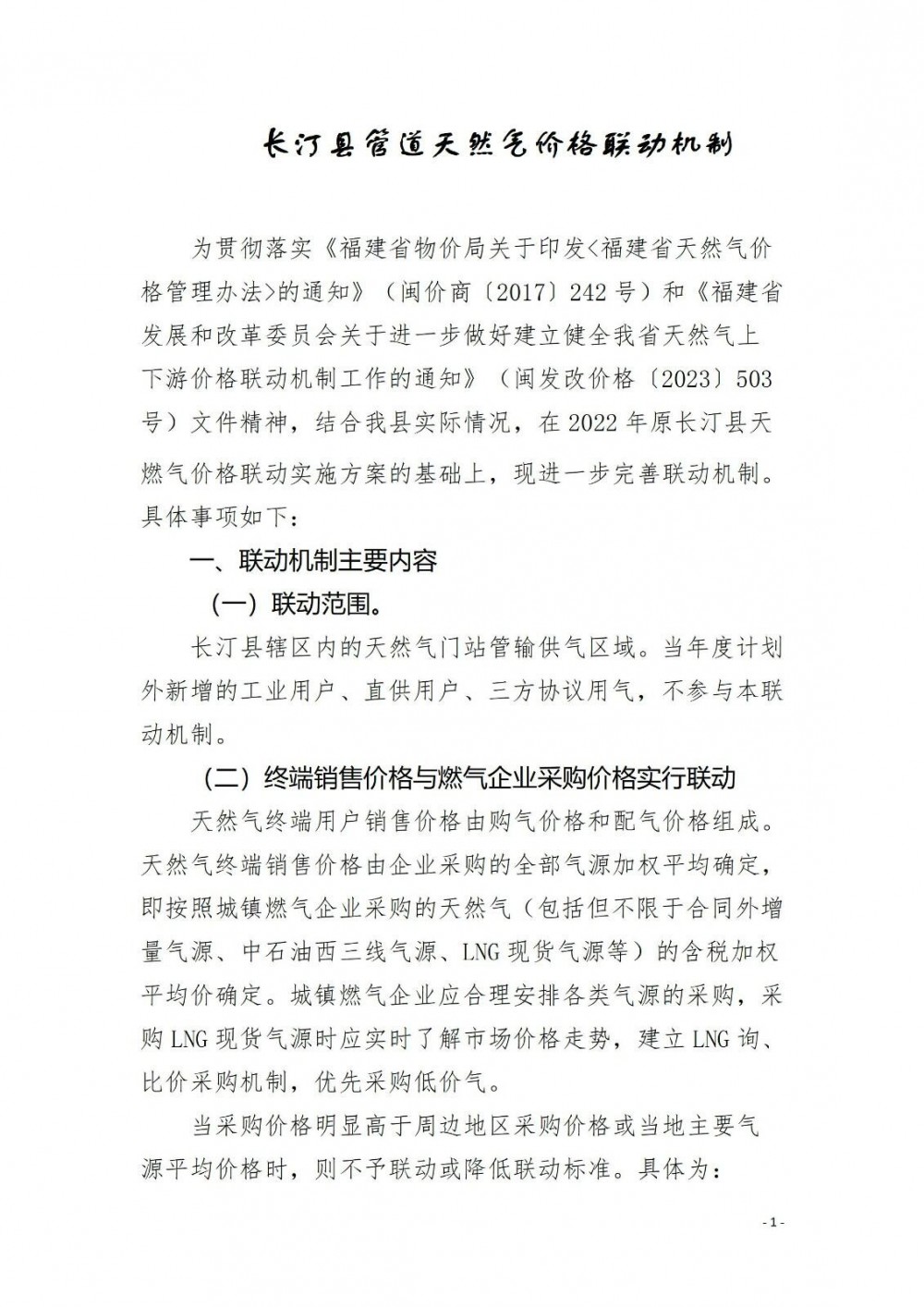 根据《福建省发展和改革委员会关于进一步做好建立健全我省天然气上下游价格联动机制工作的通知》(闽发改价格〔2023〕503号)文件精神,结合我县实际,现制定并印发长汀县管道天然气价格联动机制,请遵照执行。